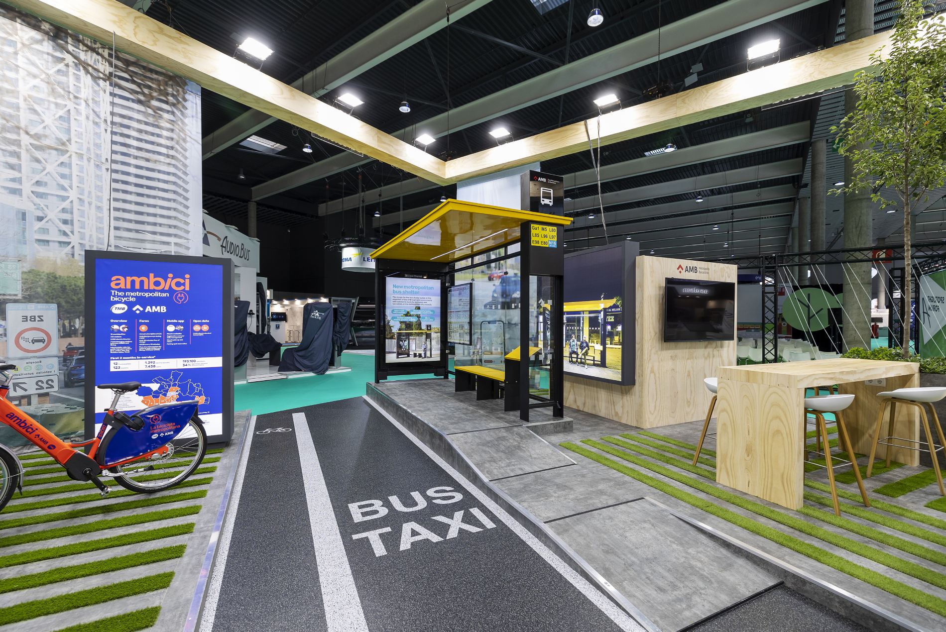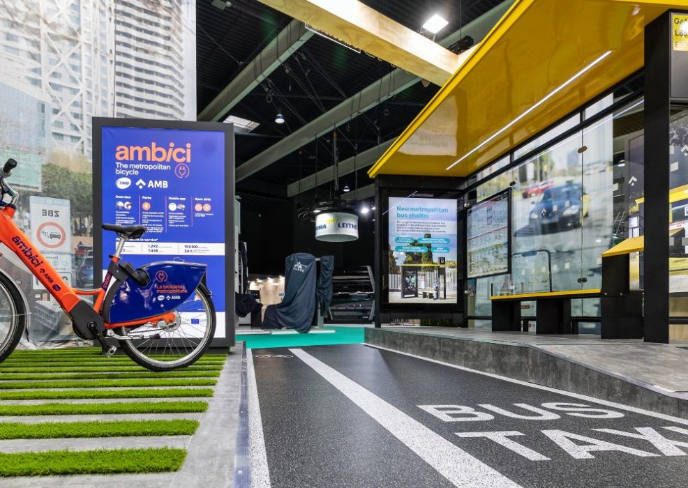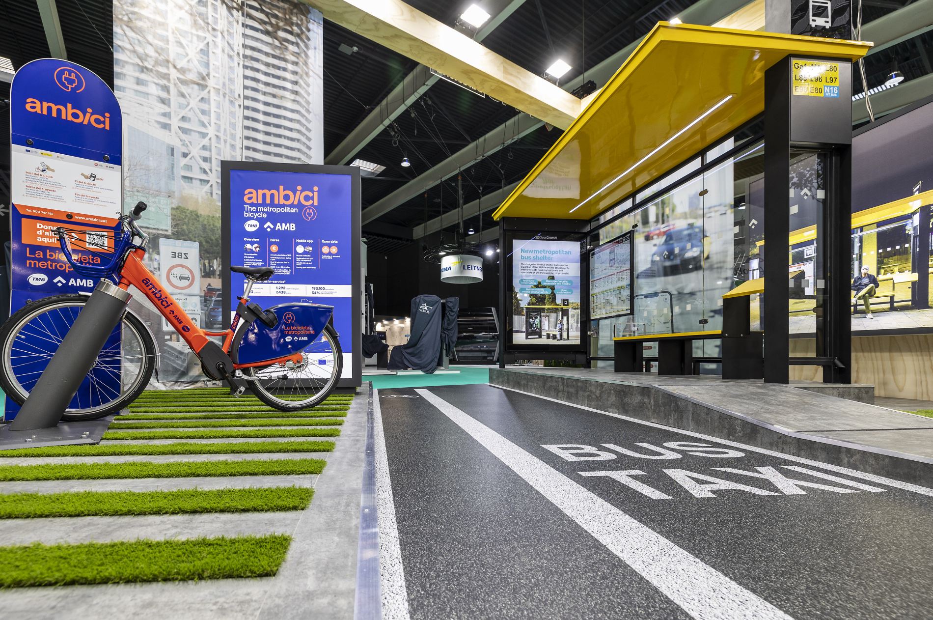 El diseño recrea un entorno urbano con calles, aceras y vegetación, brindando una experiencia inmersiva. Se han utilizado materiales sostenibles y tecnologías interactivas para resaltar las soluciones innovadoras de AMB en el transporte público.